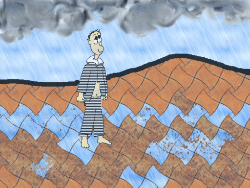 Tan pronto como atraviesas el umbral se hace la luz y te encuentras en un desierto hasta donde alcanza la vista, miras hacia atrás y el umbral ha desaparecido, solo queda la arena del desierto. De repente notas una gota en la cabeza, luego otra, parece que está empezando a llover en pleno desierto, sí, la lluvia torrencial es ya un hecho.
